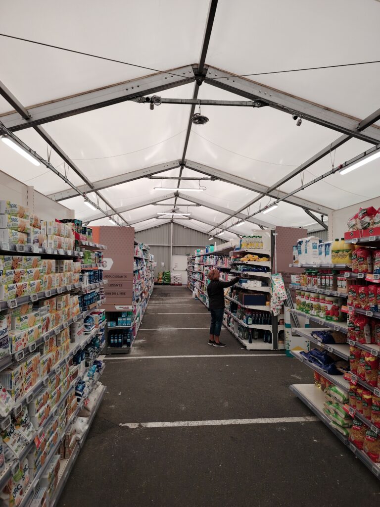 Earlier in the day, with no sign of a Mr T, we stop off to pick up some supplies (mostly wine), from an Intermarché supermarket. All goes well. The trolley is chocker-block with lots of food (wine is officially designated as being food in France) There’s just one last item we need. Some wet wipes. AKA lingettes humides. [wipe wets] Trolleying up and down every aisle we find no sign of any sort of cleaning product. Very strange. We ask un-elper – the reply “Vous les trouverez sous le chapiteau. La-bas, dans le coin” did us no favours. We’d just come from le coin. Understanding some French, but not all, can often be very misleading. Mr Google Translate said ‘chapiteau’ meant Big Top. As in circus Big Top!? . . . Was she trying to make clowns of a couple of Brits?